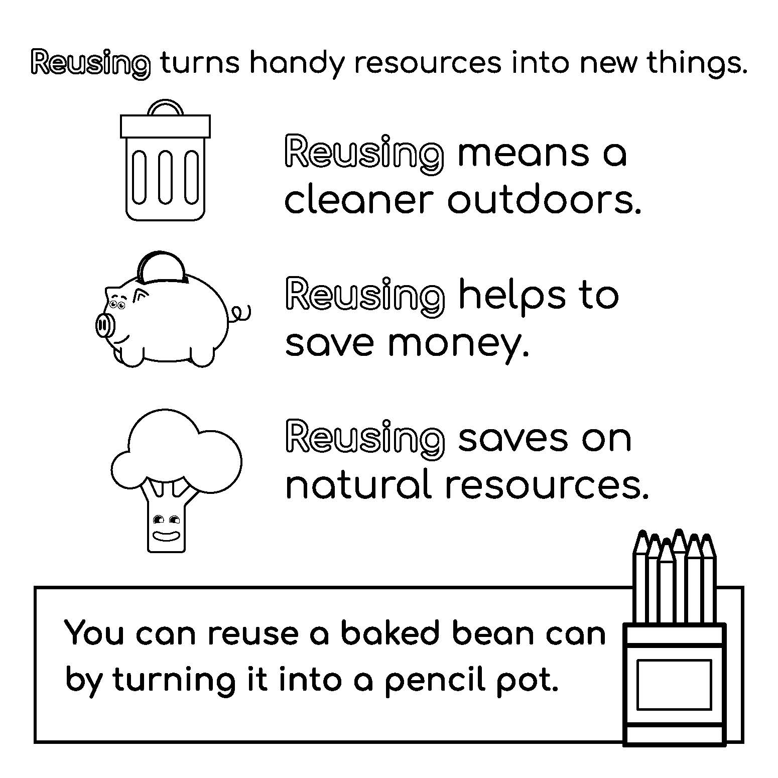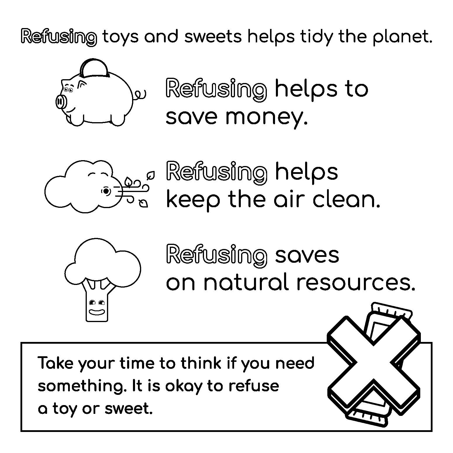 The colouring sheet version covers the following areas that children can take action against climate change: