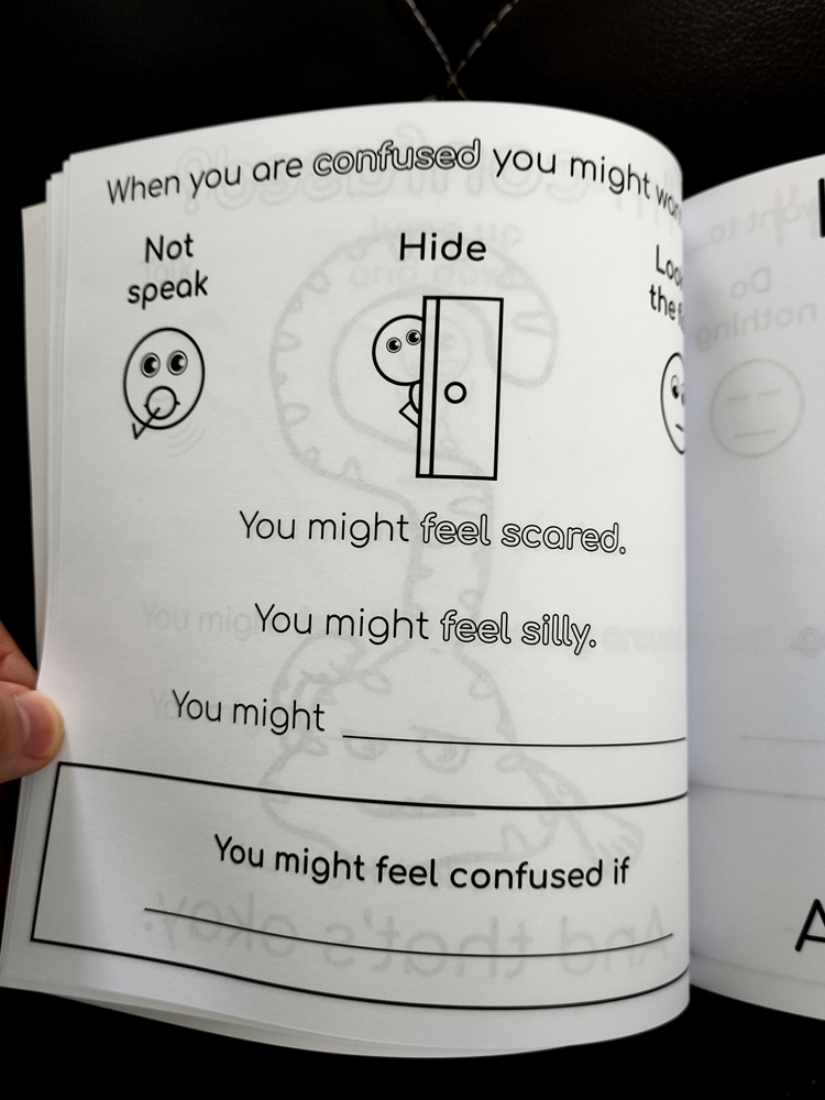 The full paid for colouring book version covers the following emotions. Children can colour in each page and also write how they feel too!
